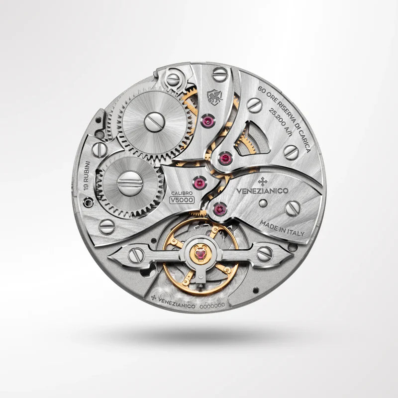 W 2025 roku wprowadziliśmy kaliber V5000, nasz pierwszy własny mechanizm mechaniczny, w całości zaprojektowany i wyprodukowany we Włoszech. Rezultat, który łączy rzemieślniczą wiedzę i precyzję inżynieryjną, stanowi odważny krok w kierunku nowej wizji niezależnego włoskiego zegarmistrzostwa.