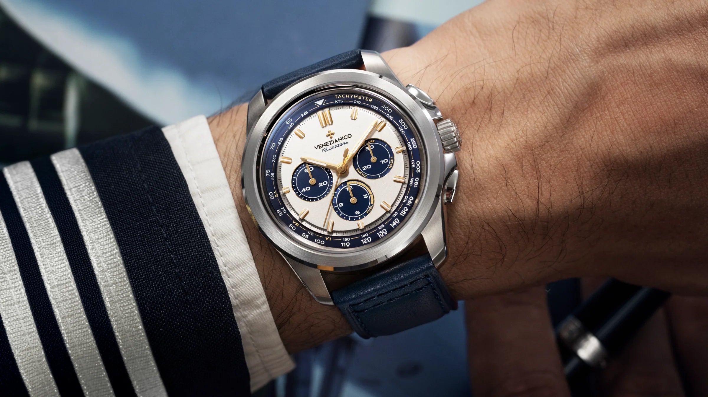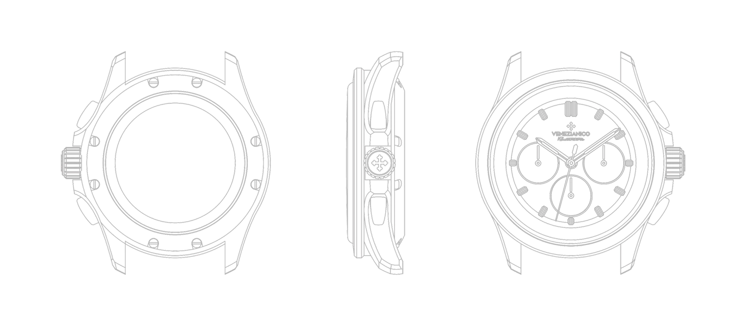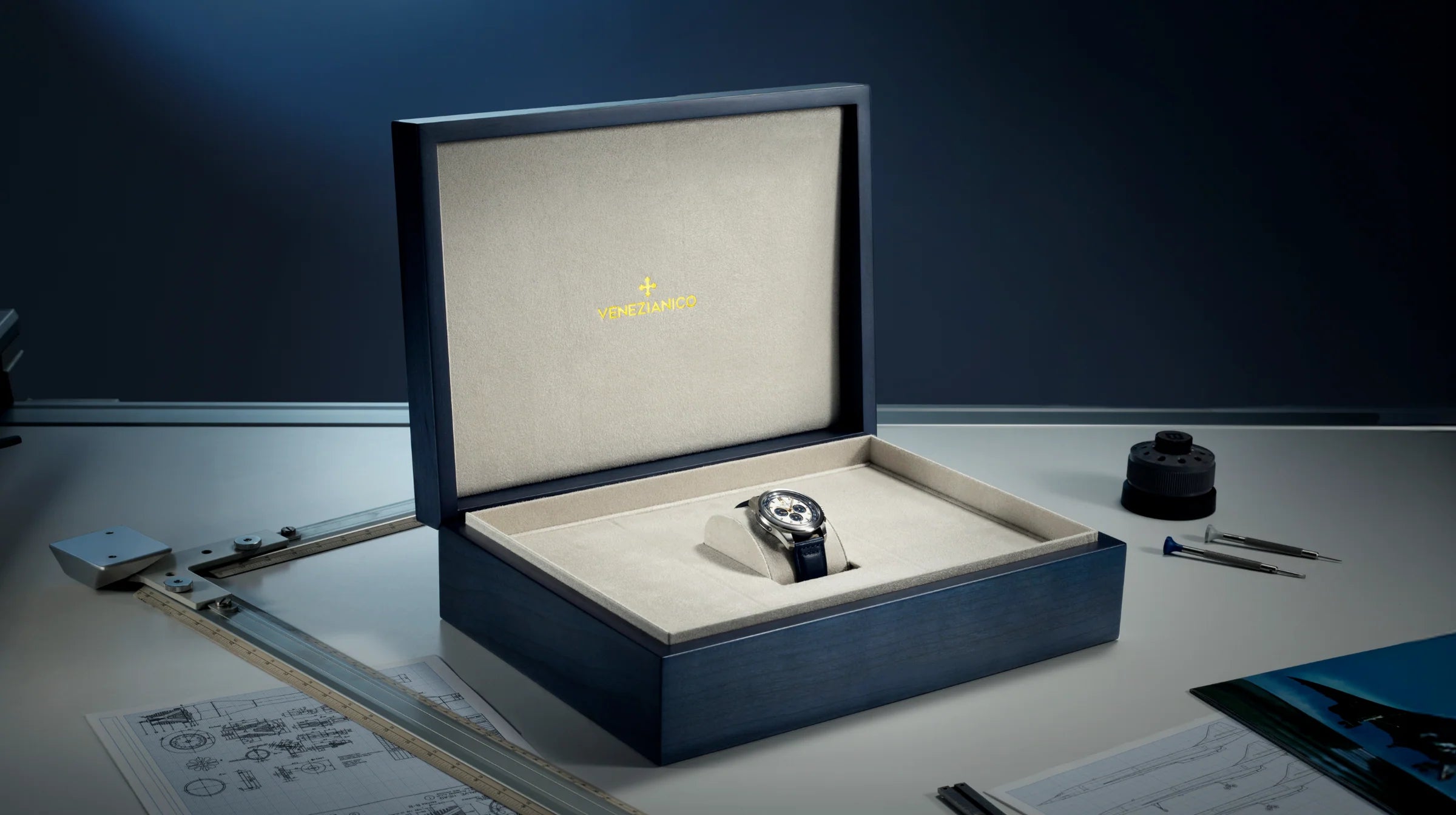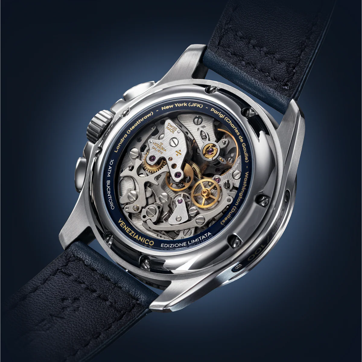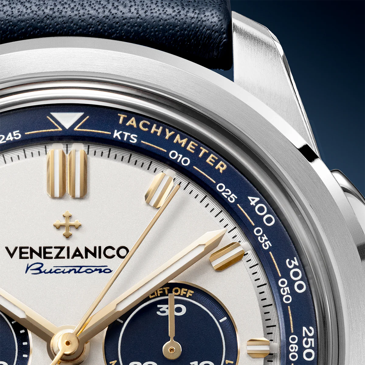 Umieszczona na tym samym osiowym poziomie co wskazówki godzin i minut, centralna wskazówka chronografu staje się głównym narzędziem monitorowania prędkości w czasie rzeczywistym. Uruchamiana, zatrzymywana i resetowana za pomocą przycisków, pozwala natychmiast rejestrować każdą zmianę. To zegarmistrzowski odpowiednik pokładowych instrumentów, które przekładały każdą ułamkową część sekundy na dane operacyjne. W Bucintoro 1976 każdy ruch wskazówki mierzy nie tylko sekundy, ale także opowiada rytm podróży i dynamikę lotu.