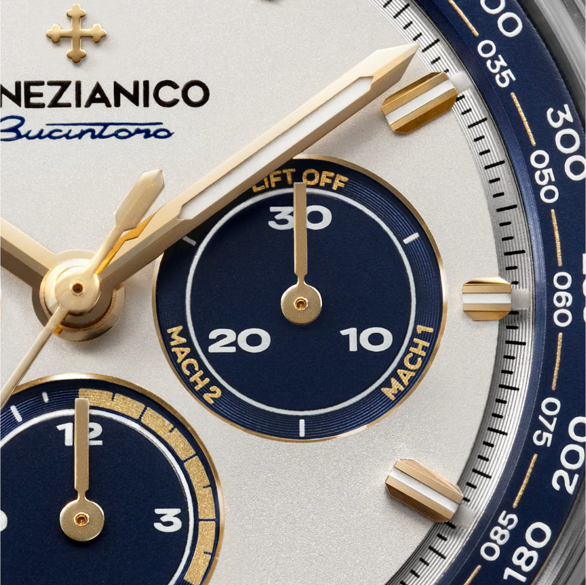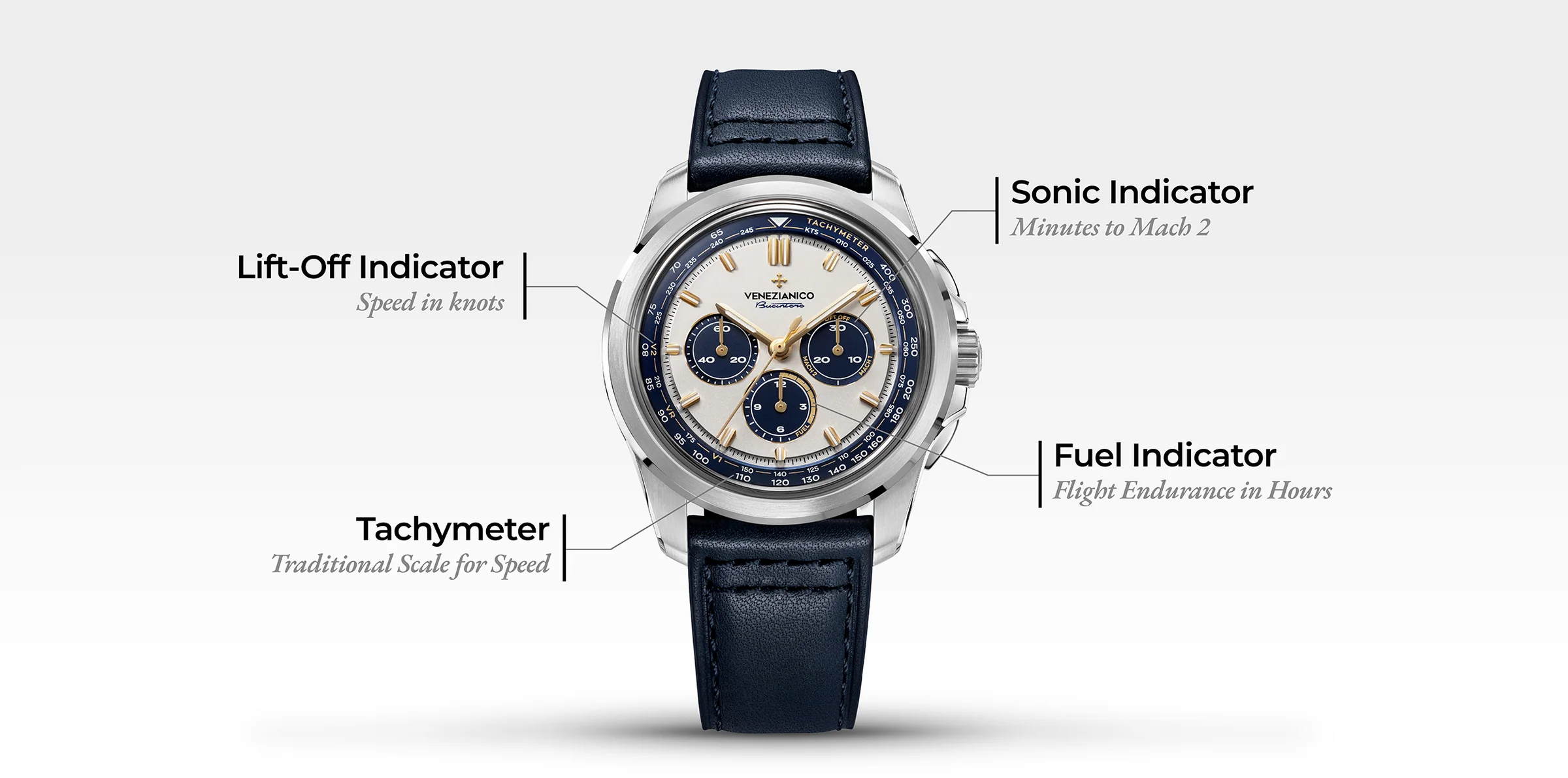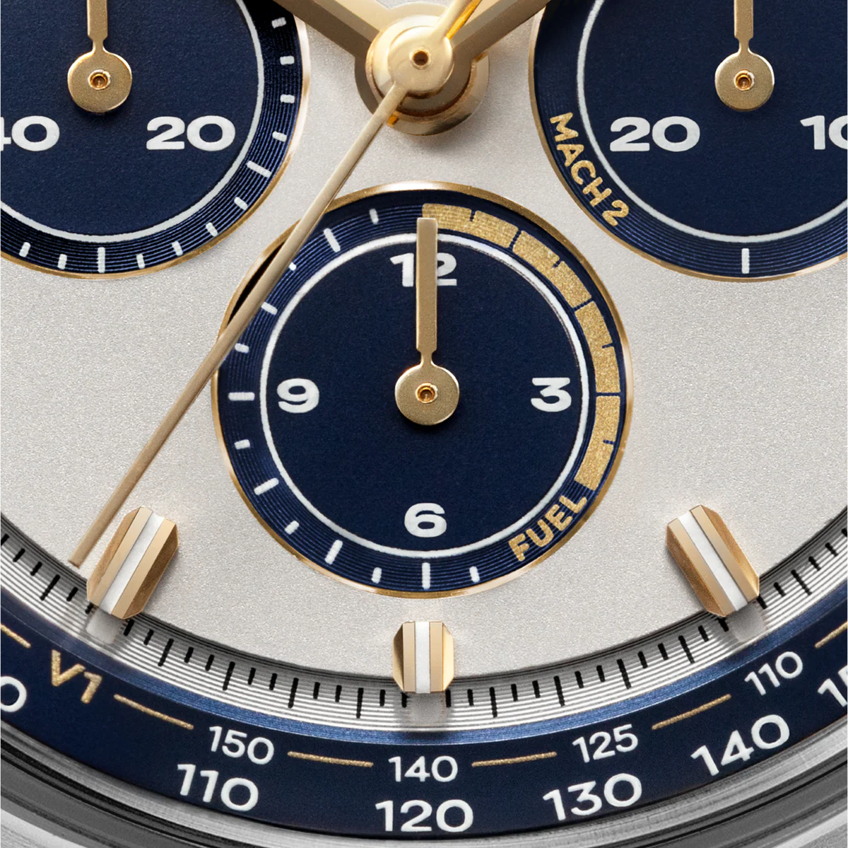 Kluczowy element do pomiaru najważniejszych faz lotu, gdy pilot musiał z absolutną precyzją kontrolować czas potrzebny do osiągnięcia docelowej prędkości. Indeksy dedykowane Mach 1 i Mach 2 nie są jedynie detalem graficznym – symbolizują dokładny moment, w którym samolot przełamywał barierę dźwięku, zamieniając oczekiwanie w napięcie, a chwilę w czystą emocję. Na tarczy Bucintoro 1976 funkcja ta staje się namacalnym symbolem ery ponaddźwiękowej, w której każda minuta była zdobyczą.