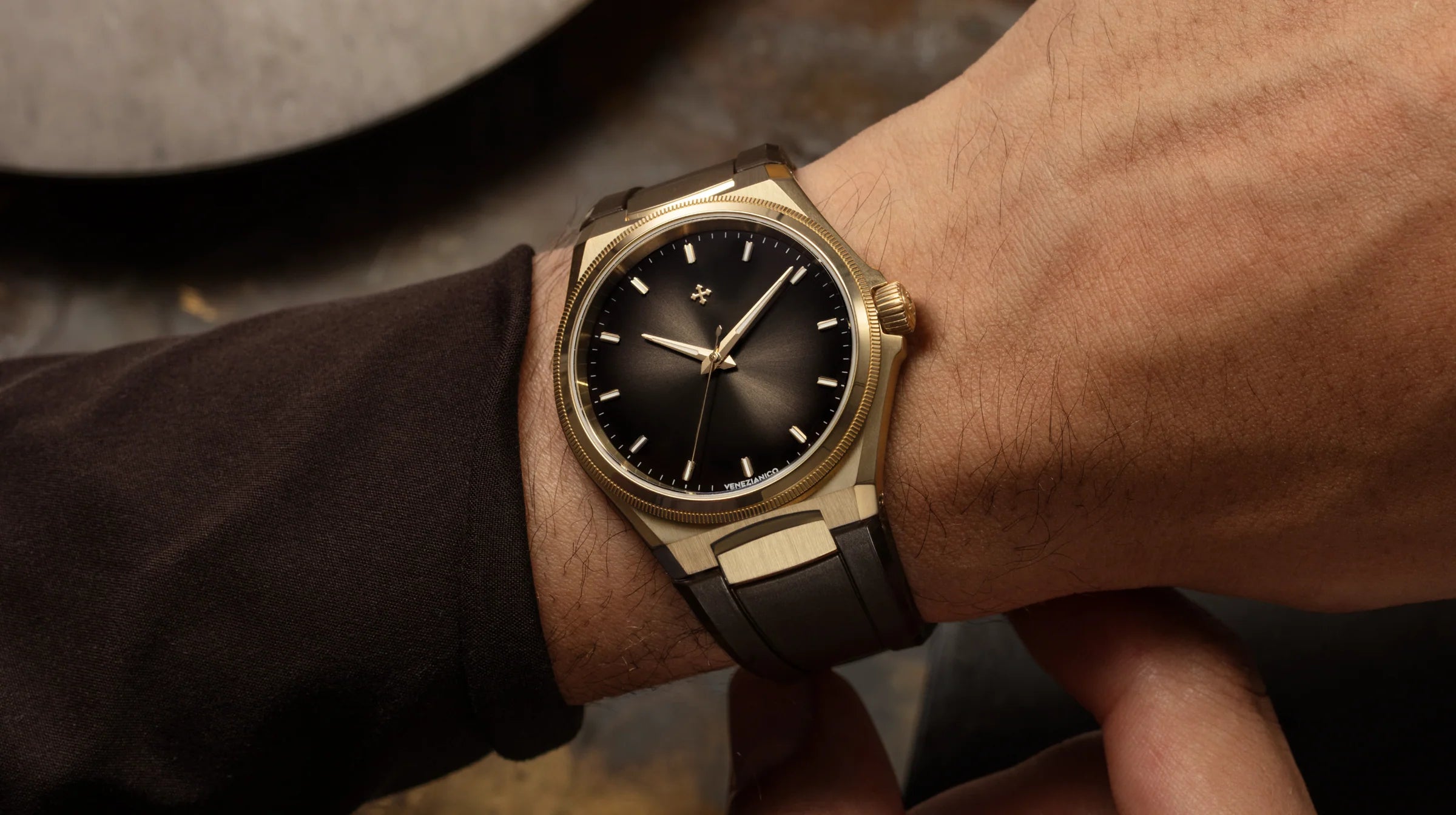 Dekiel Arsenale Bronzo to nie tylko element techniczny, lecz także dekoracyjna powierzchnia opowiadająca historię Wenecji poprzez detale. Wykonany ze stali 316L, tworzy wyraźny i elegancki kontrast z ciepłymi, zmieniającymi się tonami koperty z brązu. Grawer koni św. Marka ożywa dzięki połączeniu piaskowanego i satynowego promienistego wykończenia, które podkreśla trójwymiarowość postaci i nadaje scenie dynamiki.