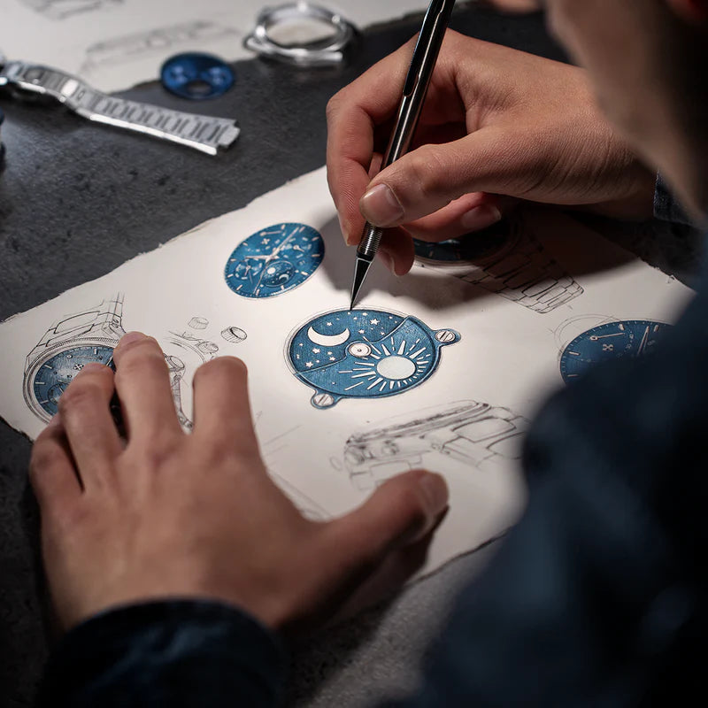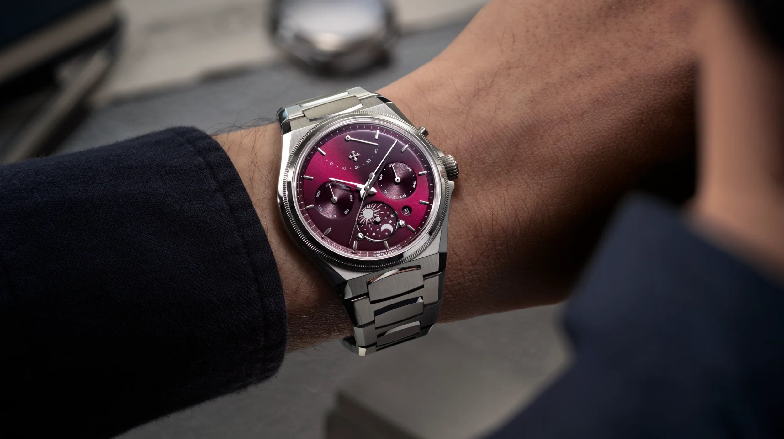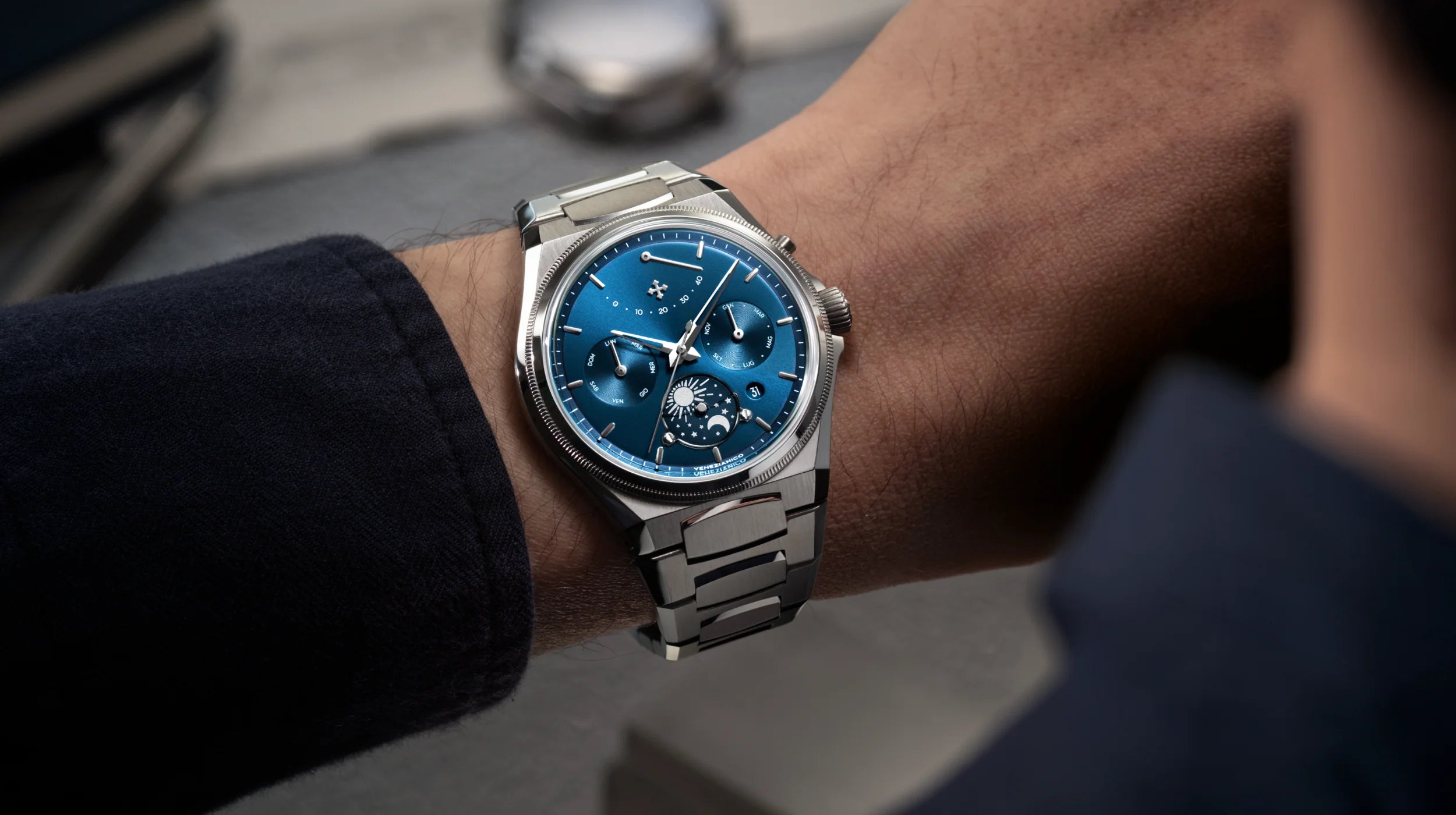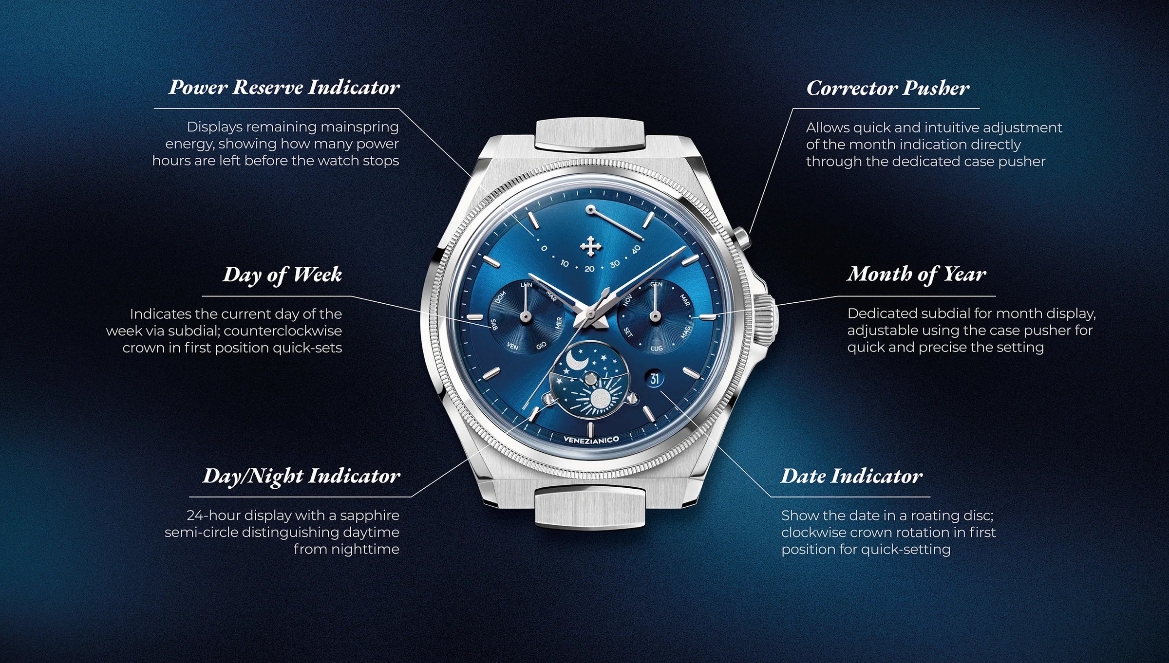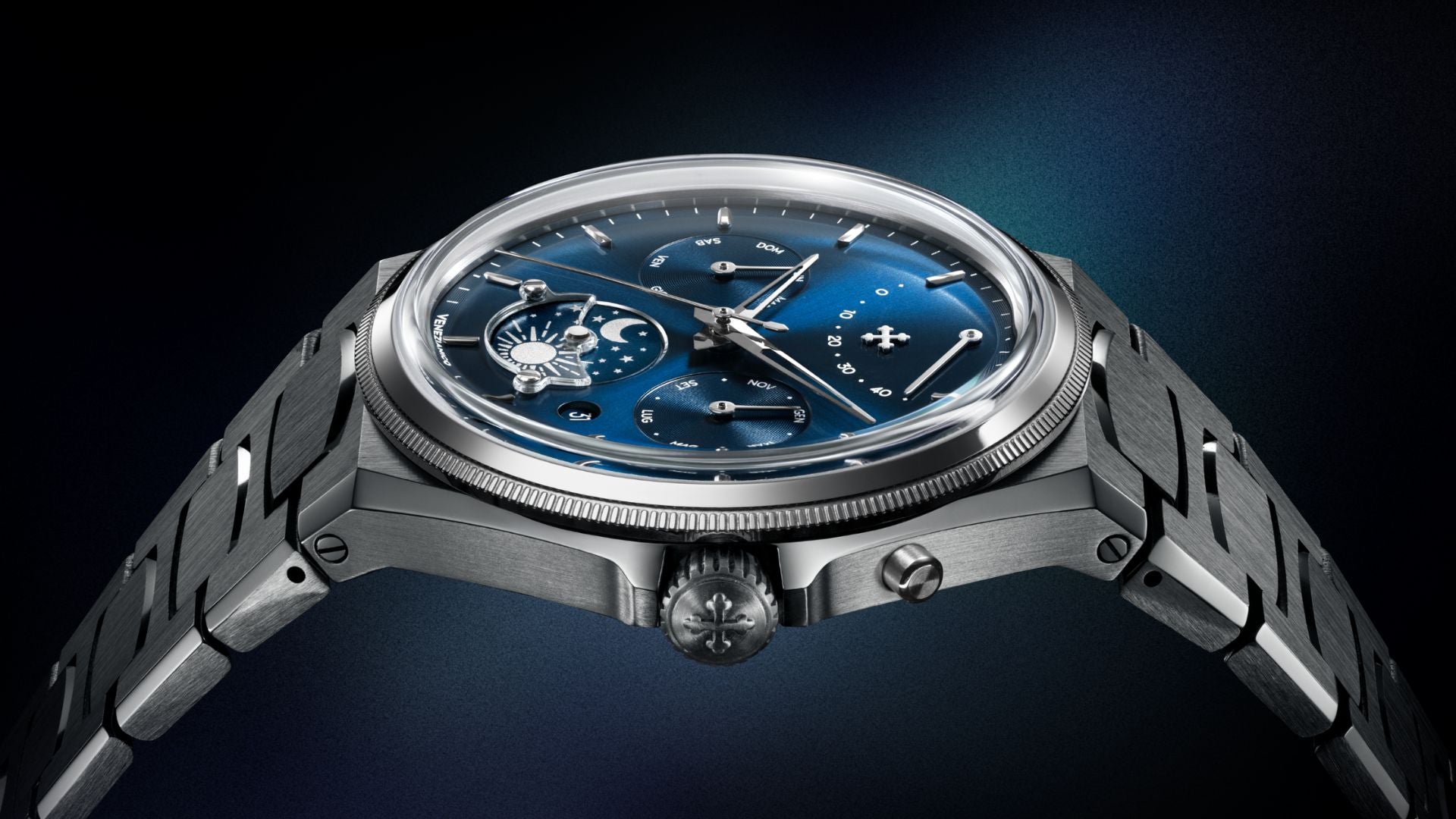 Projekt opiera się na precyzyjnym podejściu, inspirowanym logiką weneckiego Arsenału: modułowości, sekwencyjności i kontroli. Automatyczny kalendarz wyznacza układ informacji, podczas gdy dysk dzień-noc na godzinie 6 wprowadza cykliczny odczyt czasu. Na godzinie 12 wskaźnik rezerwy chodu stanowi charakterystyczny i nieszablonowy element, wkomponowany w strukturę tarczy. Szafirowy półksiężyc, przymocowany śrubami, uwydatnia tę funkcję i definiuje jej działanie, współtworząc solidną i trwałą konstrukcję.