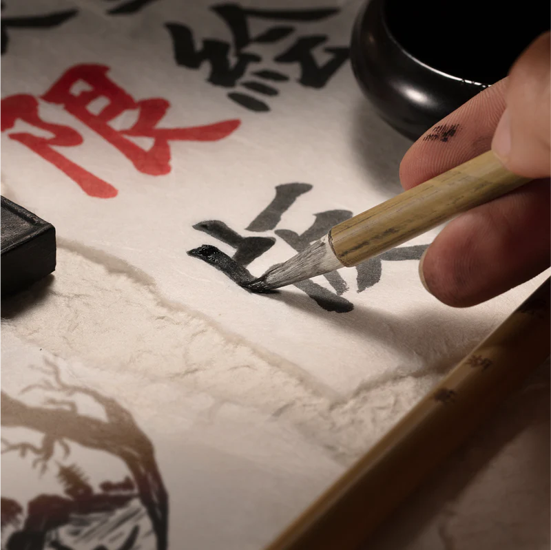 Odwzorowanie złożoności pociągnięcia pędzla Sumi-e w tak małej skali wymagało absolutnej precyzji. Każdy etap procesu tampodruku polega na nanoszeniu tuszu z milimetrową dokładnością, przy jednoczesnym zachowaniu faktury i naturalnych nieregularności papieru washi. Warstwa po warstwie wzór nabiera kształtu, odsłaniając pełny obraz z tymi samymi odcieniami i kontrastami, co oryginalne dzieło.