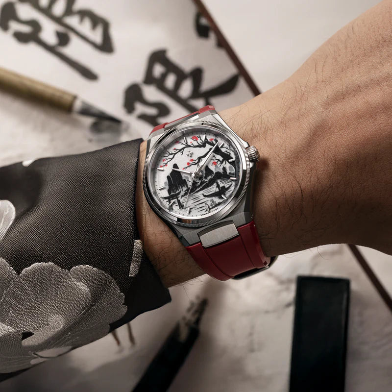 Arsenale Sumi-e 墨絵 powstał z połączenia dwóch tradycji, które łączy wspólna wizja harmonii. Satynowana koperta ze stali szlachetnej, o precyzyjnych proporcjach, współgra z tarczą z papieru washi, którego naturalna faktura odbija światło niczym pociągnięcie tuszu po wodzie.