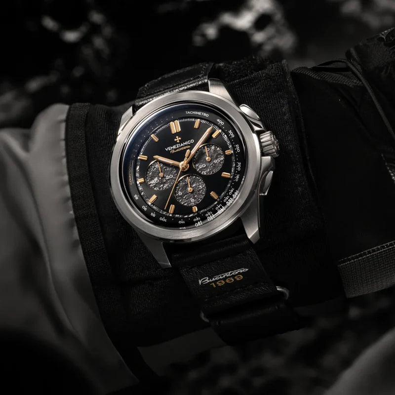 Kierując się naszym pionierskim duchem, rozpoczęliśmy przygodę w Szwajcarii w poszukiwaniu 69 mechanizmów Lemania 1873, prawdziwych skarbów szwajcarskiego zegarmistrzostwa z lat 70-tych. Mechanizmy te, oprócz opowiadania historii zegarmistrzostwa, upamiętniają jedno z najważniejszych wydarzeń w historii ludzkości: lądowanie na Księżycu w 1969 roku. W ciągu sześciu miesięcy ukończyliśmy drobiazgowy proces renowacji, tchnąc nowe życie i blask w te mechaniczne klejnoty, bijące serce limitowanej edycji Bucintoro 1969.