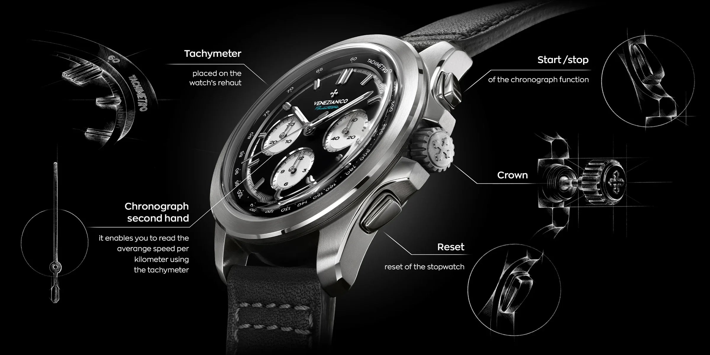 Nasz chronograf, wodoszczelny do 100 metrów, nosi nazwę Bucintoro – legendarnego statku ceremonialnego weneckiej tradycji. Łącząc precyzję z wysokimi osiągami, ten zegarek został stworzony dla osób poszukujących elegancji i niezawodności w każdej chwili.