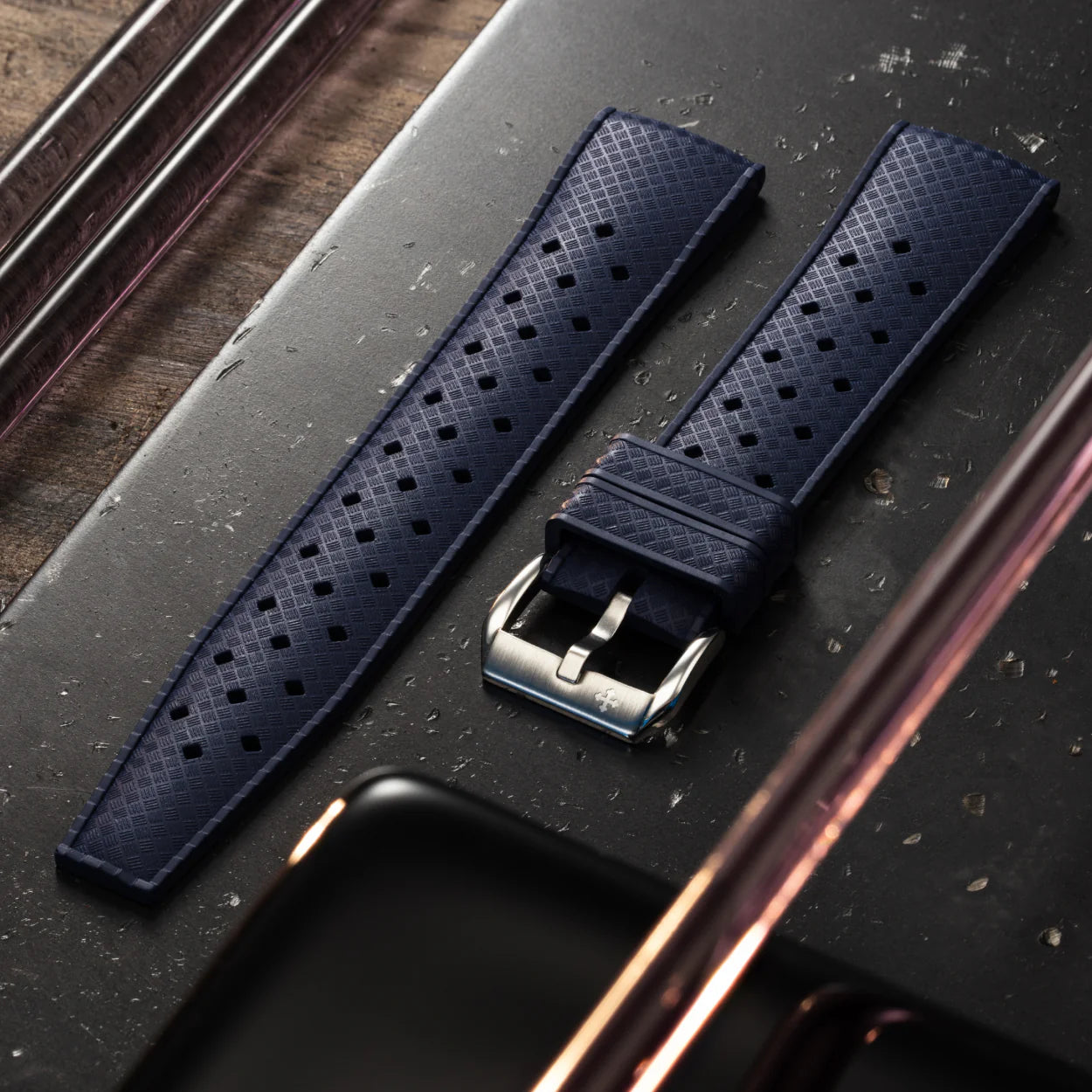 Pasek Tropic, stworzony w latach 60. i 70. XX wieku z myślą o smukłych zegarkach dla nurków, zyskał uznanie miłośników nurkowania dzięki swojej lekkości, elastyczności oraz charakterystycznemu plecionemu wzorowi z oddychającymi otworami. Na nowo zinterpretowany dla modelu Nereide, został wykonany z galwanizowanej gumy FKM, łącząc urok ponadczasowej klasyki z materiałem, który gwarantuje trwałość i niezawodność.