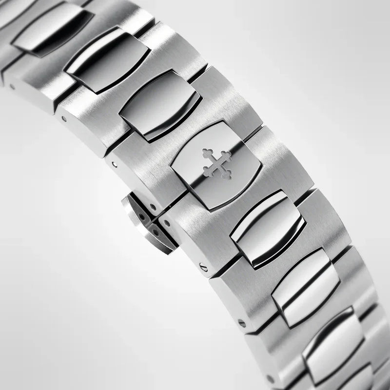 Koperta łączy płynne linie z wyraźnymi krawędziami, dodatkowo podkreślonymi przez podwójne wykończenie. Polerowanie powierzchni poziomych nadaje jej klasycznego charakteru, podczas gdy precyzyjne szczotkowanie powierzchni pionowych zapewnia nowoczesny i wyrafinowany profil.