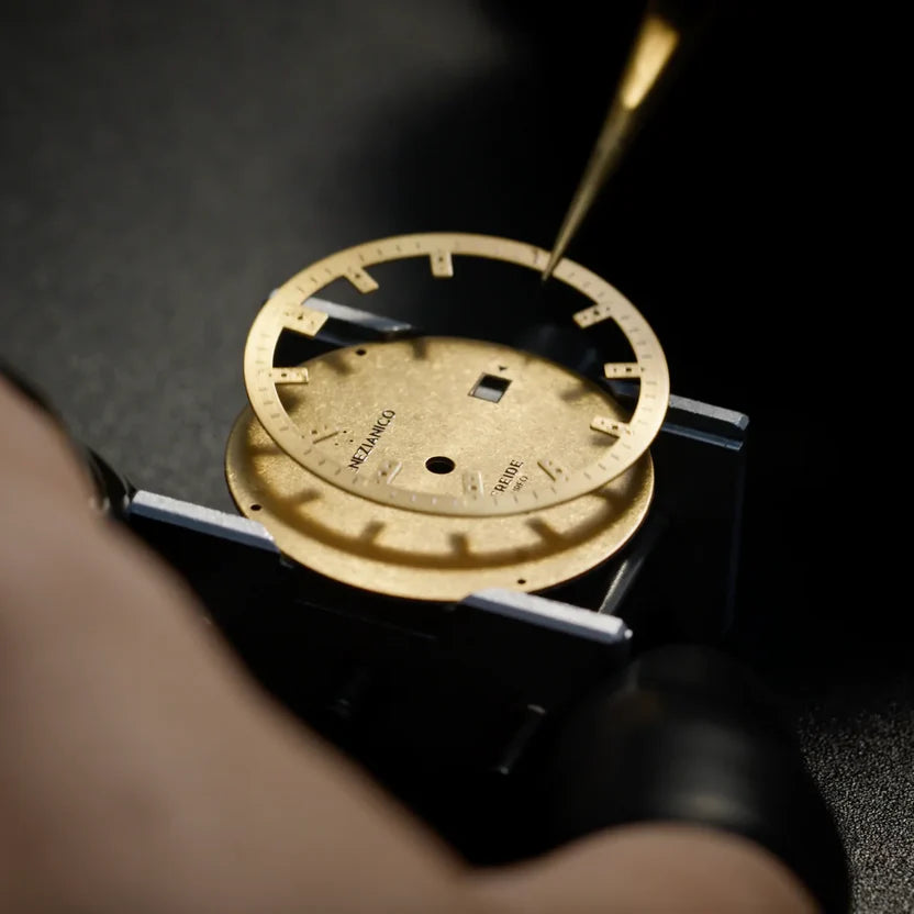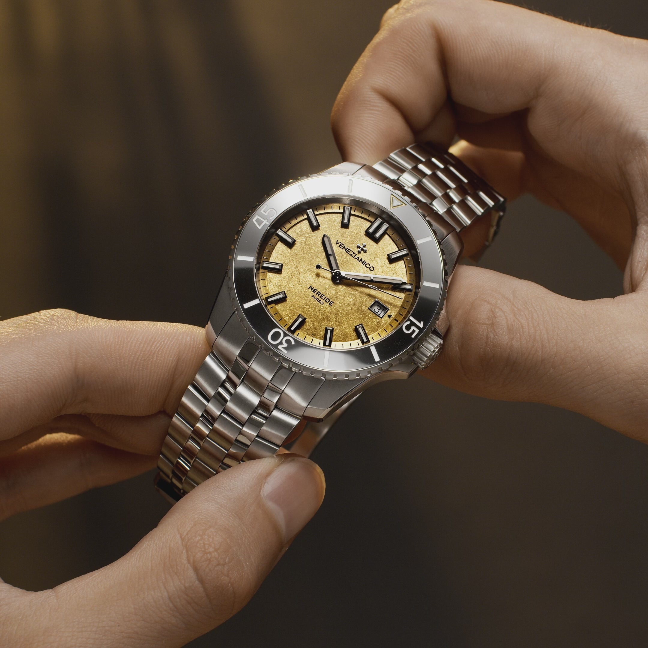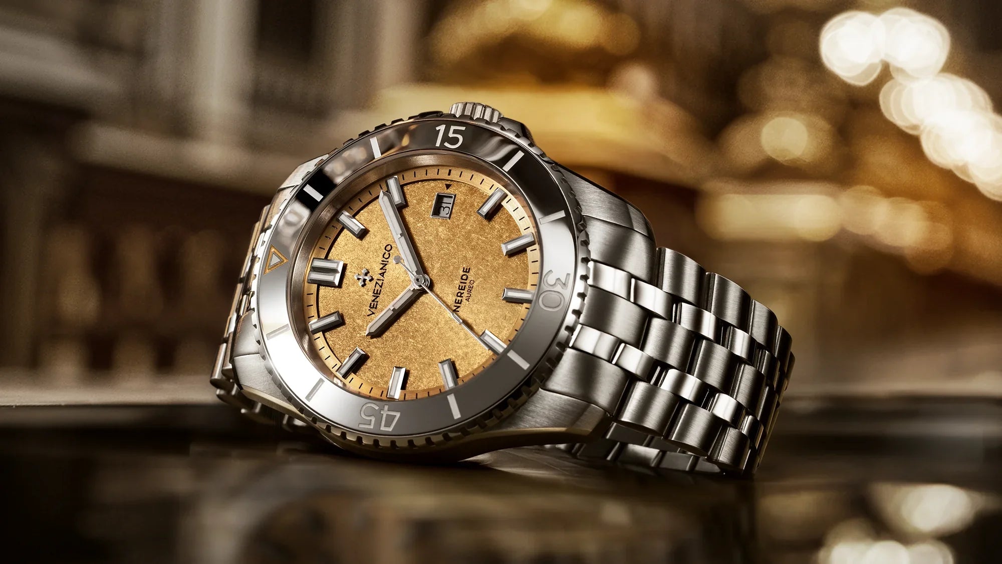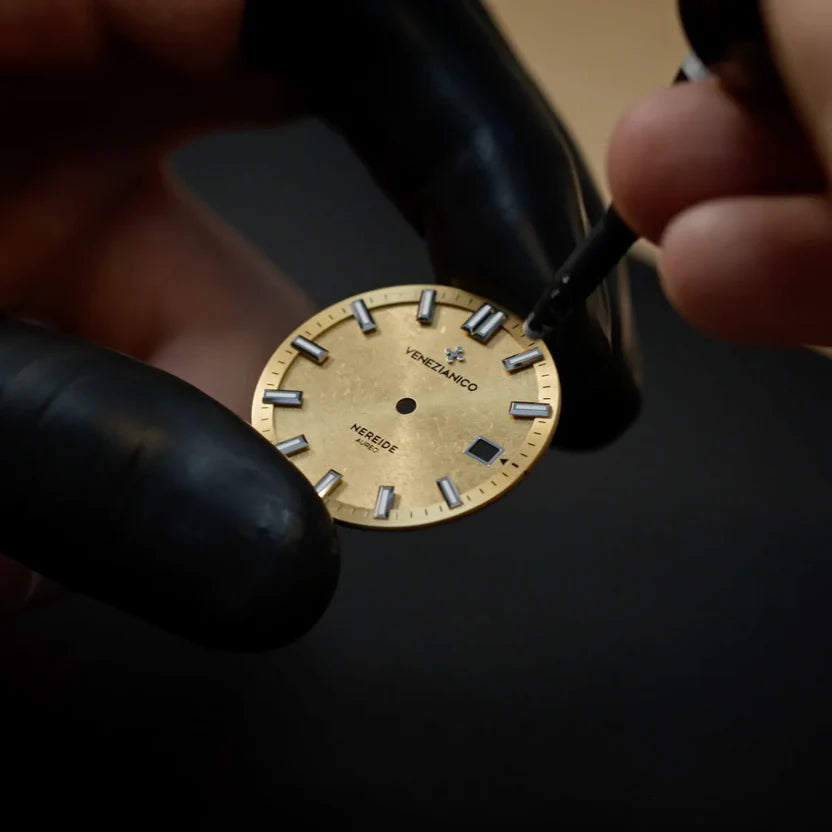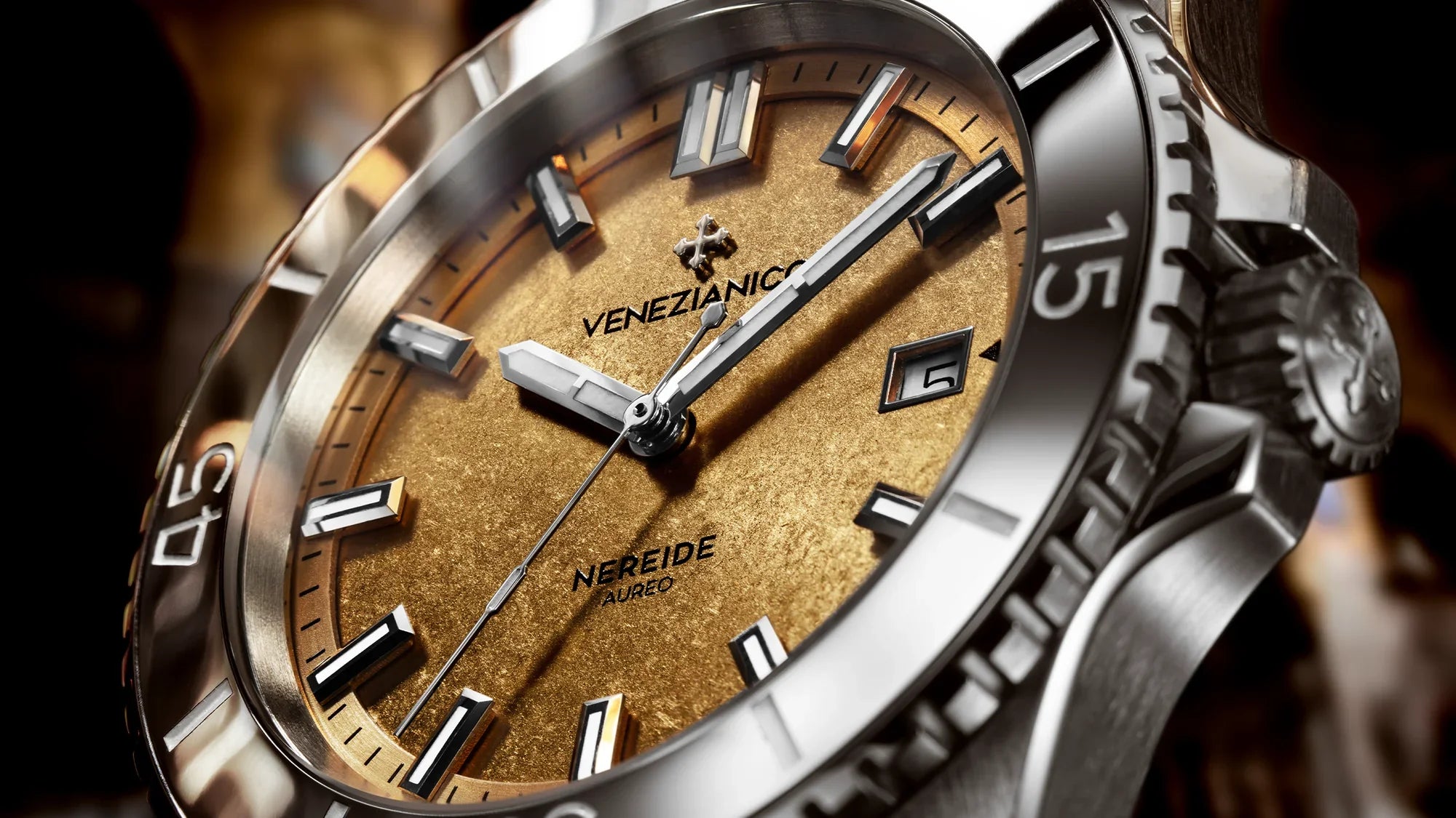 Nereide Aureo to zegarek do nurkowania, który łączy w sobie elegancję i nowoczesność. Jego tarcza, zdobiona czystym złotem 24k i falistym wykończeniem, nawiązuje do starożytnej weneckiej sztuki laminowania.