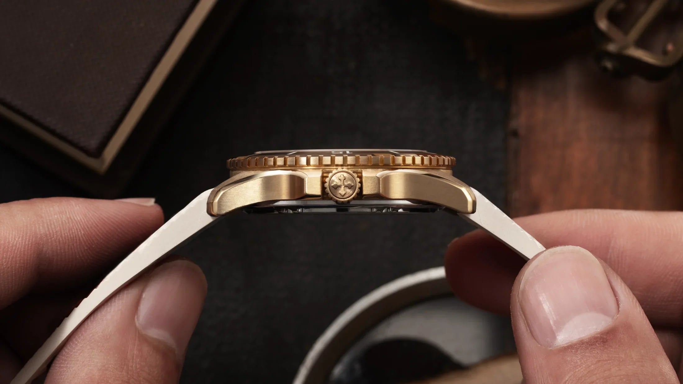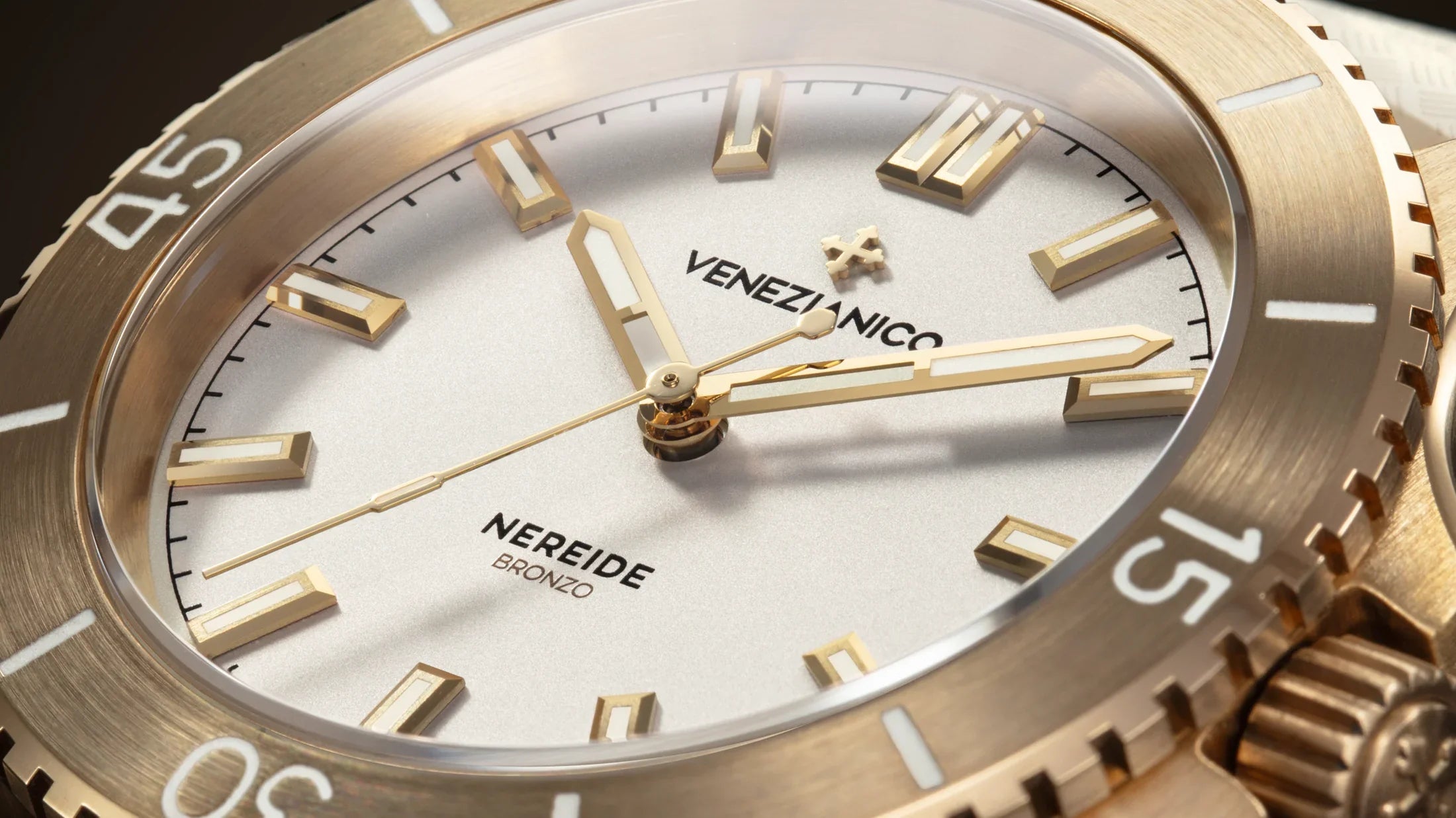 Stworzyliśmy dedykowaną tarczę, która pozostaje wierna stylowi Nereide, a jednocześnie wprowadza świeże akcenty. Nakładane indeksy w kształcie sztabek mają satynowo szczotkowaną górną powierzchnię, podkreślającą ich geometryczną formę. Po raz pierwszy zastosowaliśmy złocony nadruk, inspirowany zegarkami nurkowymi z lat 50. XX wieku. Złote napisy i znaczniki minutowe uzupełnia cienki okrąg okalający tarczę – ukłon w stronę estetyki vintage, przy jednoczesnym zachowaniu nowoczesnego charakteru.
