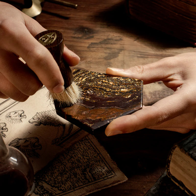 Tarcza powstaje z wyselekcjonowanych plastrów kamienia Iron Tiger, które są odpowiednio orientowane i wycinane, aby wydobyć oraz wyeksponować ich naturalny układ warstw. Każdy dysk tarczy jest pocieniany do grubości około 0,4 mm, co pozwala zachować integralność strukturalną niezbędną do prawidłowego montażu mechanizmu i wskazówek. Precyzyjnie kontrolowany proces polerowania nadaje powierzchni ostateczny szlif i uwydatnia kontrast między żelazistą czerwienią a złocistymi refleksami, przygotowując bazę pod nałożenie indeksów oraz pozostałych detali.