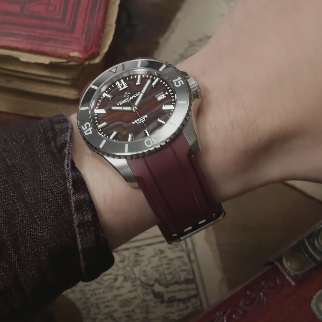Nereide Chimera to model, który eksploruje koncepcję jedności wyrażoną poprzez dobór szlachetnych materiałów. Jego tarczę wykonano z Iron Tiger – kamienia kompozytowego, w którego skład wchodzą tygrysie oko, czerwony jaspis oraz hematyt. Te odmienne minerały przenikają się, tworząc spójną strukturę o wyraźnych, naturalnych uwarstwieniach i niezwykłej głębi wizualnej.