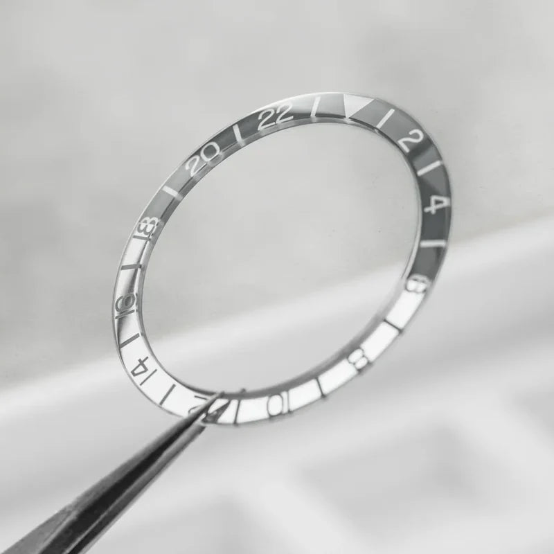 Wkładka bezela wykonana została z kryształu optycznego BK7, z unikalnym lustrzanym wykończeniem w dolnej części – charakterystycznym dla kolekcji GMT. Materiał ten wyróżnia się wyjątkowymi właściwościami fizycznymi: jest wolny od ołowiu, lżejszy i jakościowo przewyższa inne szkła. Niska dyspersja (liczba Abbego ok. 60), niski współczynnik załamania światła (≈1,52) oraz wysoka przejrzystość sprawiają, że BK7 idealnie nadaje się do tworzenia precyzyjnych i trwałych elementów szklanych.