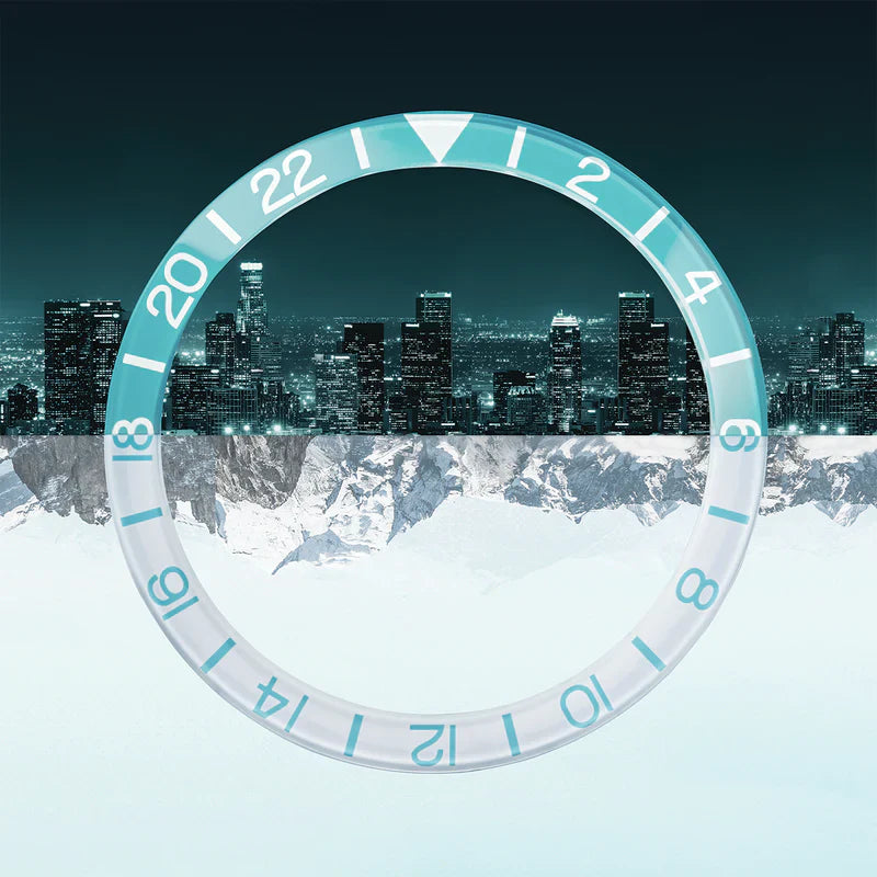 Wkładka bezela wykonana została z kryształu optycznego BK7, z unikalnym lustrzanym wykończeniem w dolnej części – charakterystycznym dla kolekcji GMT. Materiał ten wyróżnia się wyjątkowymi właściwościami fizycznymi: jest wolny od ołowiu, lżejszy i jakościowo przewyższa inne szkła. Niska dyspersja (liczba Abbego ok. 60), niski współczynnik załamania światła (≈1,52) oraz wysoka przejrzystość sprawiają, że BK7 idealnie nadaje się do tworzenia precyzyjnych i trwałych elementów szklanych.