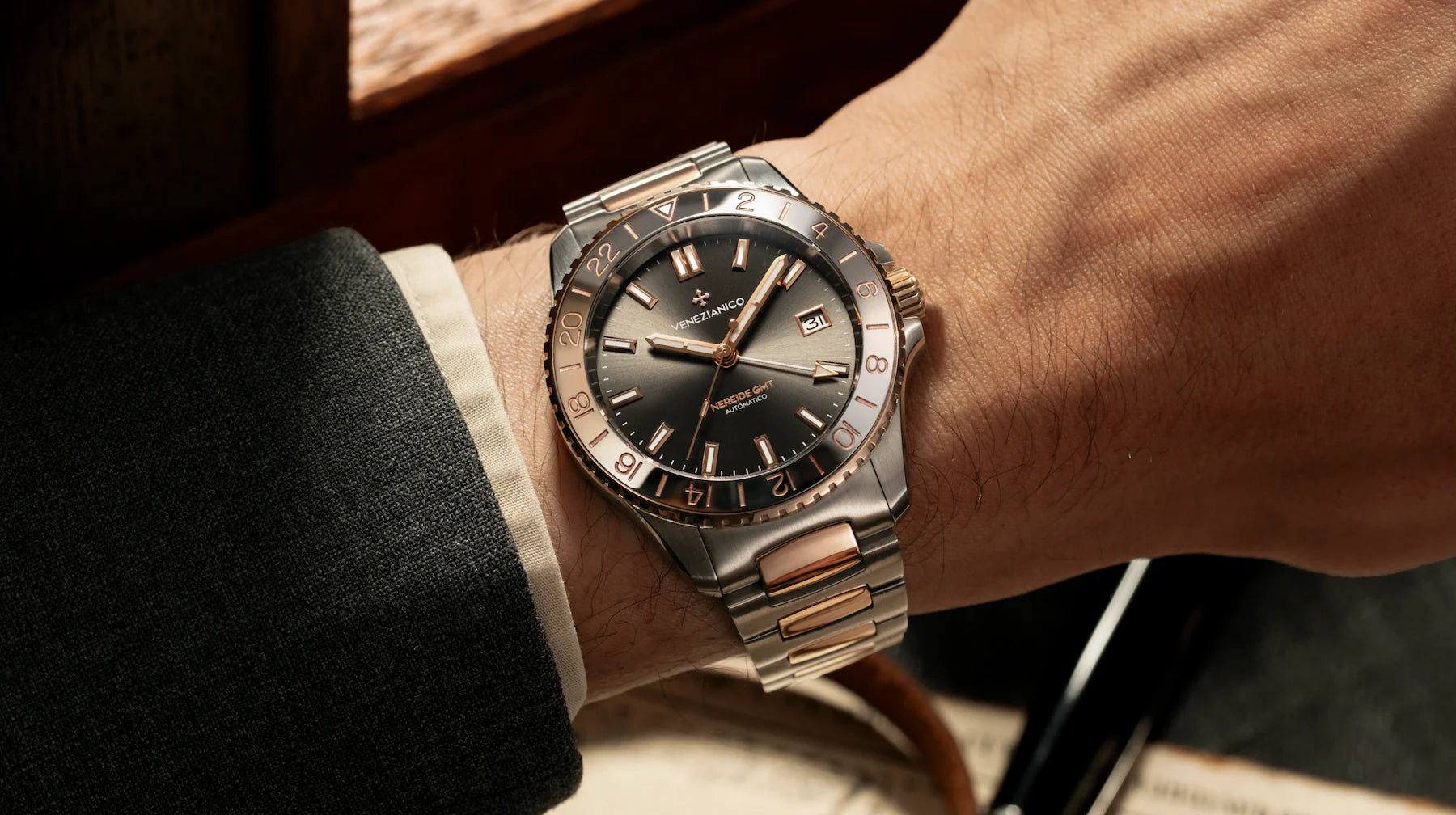 Noszenie zegarka Nereide GMT Grand Tour to sposób, by mieć przy sobie ducha podróży rozumianej jako forma poznania. Jego kompaktowe proporcje i idealnie wyważona masa gwarantują wygodę w każdej sytuacji — zarówno podczas długich wypraw, jak i w codziennym życiu. Kontrast między stalą nierdzewną a różowym złotem 5N nadaje mu wyrafinowaną, uniwersalną elegancję, a funkcja True GMT pozwala odczytać dwie strefy czasowe jednym spojrzeniem, zapewniając ciągłość i precyzję w każdej podróży.