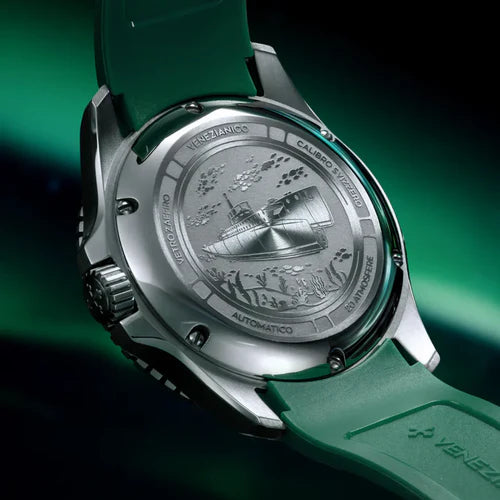 Łódź podwodna Nereide, która zainspirowała całą kolekcję, została przedstawiona w grawerunku na środku dekla, w zanurzeniu. To symbol tego, że zegarek nie ustępuje w kwestii parametrów nurkowych – zachowuje wodoodporność do 200 metrów i posiada obrotowy bezel umożliwiający precyzyjne mierzenie czasu nurkowania.