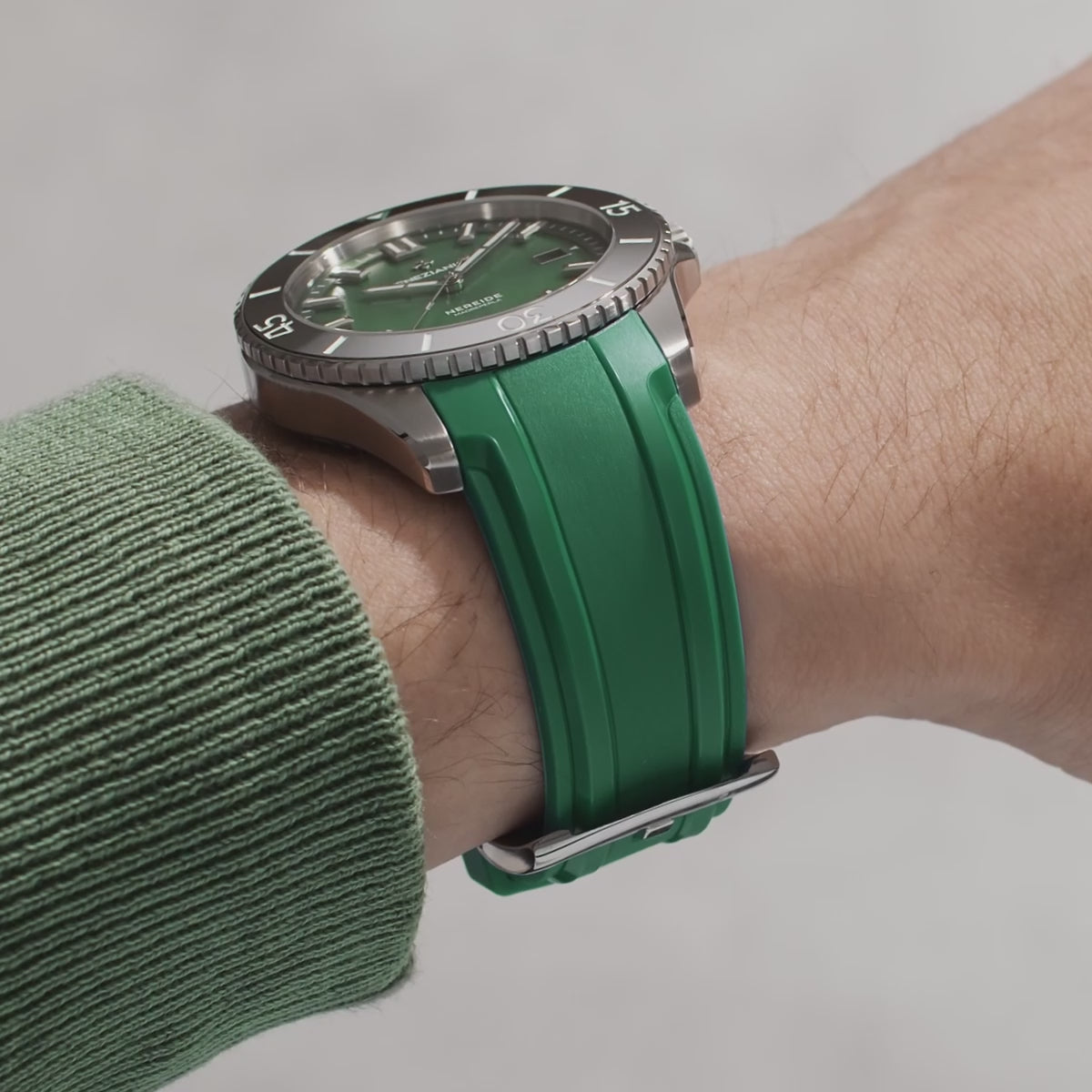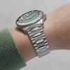 Masa perłowa to cenny, naturalny materiał powstający wewnątrz muszli mięczaków, takich jak ostrygi. Jej wyjątkowa opalizacja sprawia, że jest podziwiana za bogactwo barw i refleksów. W modelu Nereide Madreperla wybrano odcień zieleni, który przywołuje magię i intensywność zorzy polarnej, nadając zegarkowi wyrazisty i urzekający charakter.
