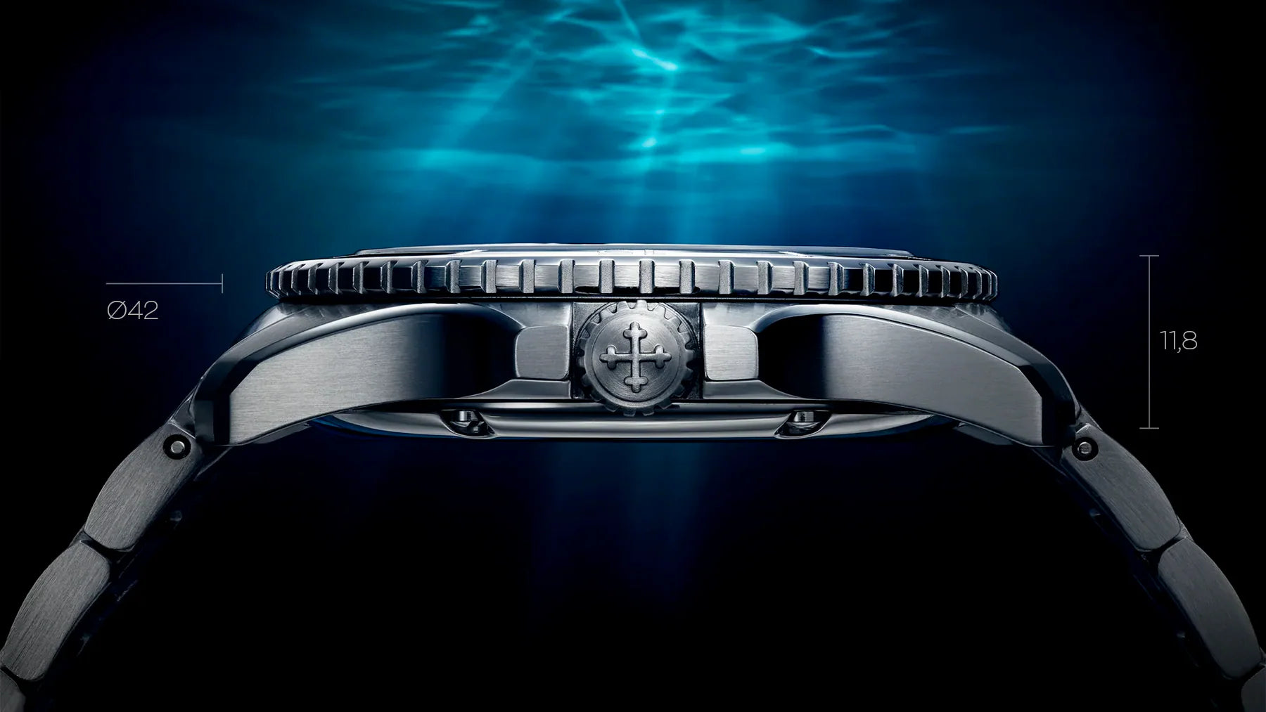 Łódź podwodna Nereide, która stała się inspiracją dla całej kolekcji, została przedstawiona w grawerunku na środku dekla, w zanurzeniu. To symbol, że zegarek nie ustępuje w kwestii parametrów nurkowych – zachowuje wodoodporność do 200 metrów oraz wyposażony jest w obrotowy bezel umożliwiający precyzyjne mierzenie czasu nurkowania.