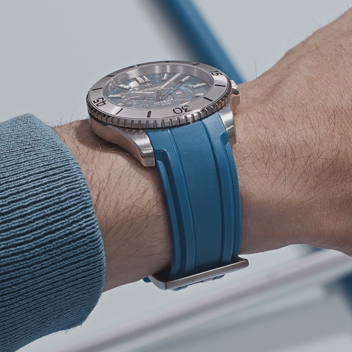 Nereide Ultraleggero to model o wyrazistej tożsamości i sportowym charakterze. Jego dopracowany design uzupełnia gumowy pasek, który harmonijnie współgra z kształtem koperty. Dzięki elastyczności i sprężystości zapewnia wyjątkowy komfort noszenia, a jednocześnie gwarantuje wysoką odporność na ścieranie i skrajne temperatury – od -30°C do +70°C.