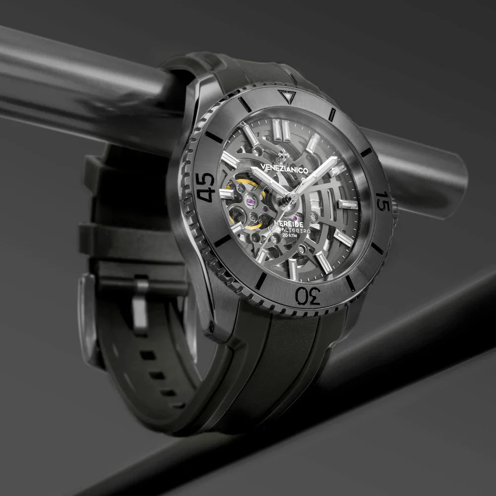 Nereide Ultraleggero to model o wyrazistej tożsamości i sportowym charakterze. Jego dopracowany design uzupełnia gumowy pasek, który harmonijnie współgra z kształtem koperty. Dzięki elastyczności i sprężystości zapewnia wyjątkowy komfort noszenia, a jednocześnie gwarantuje wysoką odporność na ścieranie i skrajne temperatury – od -30°C do +70°C.