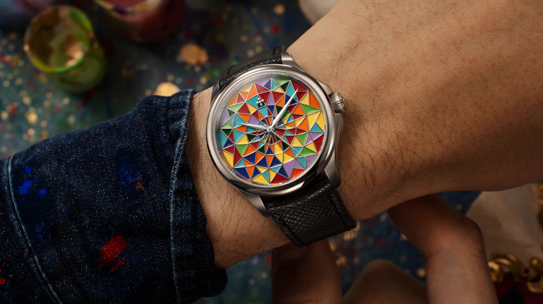 Tarcza stanowi mozaikę wyrzeźbionych geometrycznych sektorów, w której każda komórka nabiera kształtu dzięki polerowanym płaszczyznom i wyraźnym krawędziom ze srebrzystego metalu. Trójwymiarowa struktura oddziela i uwydatnia każdy z odcieni, tworząc uporządkowany projekt, który prowadzi wzrok wzdłuż czystych linii i precyzyjnych kątów. Emaliowane płaszczyzny przy każdym ruchu nadgarstka inaczej odbijają światło, podczas gdy polerowane, srebrzyste profile podkreślają geometrię i nadają całej kompozycji wyjątkowej głębi.