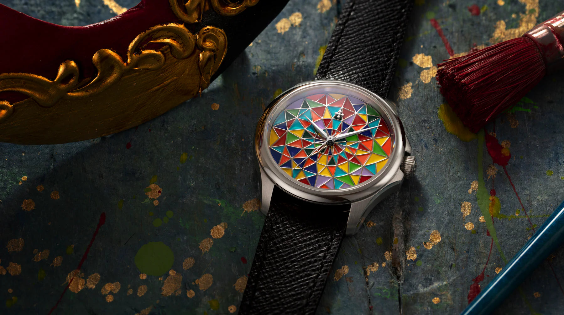 Proces powstawania tarczy rozpoczyna się od bazy z wygrawerowaną, precyzyjną, trójwymiarową geometrią, zaprojektowaną tak, by przyjąć barwy niczym prawdziwe dzieło sztuki. Każda pojedyncza komórka jest następnie ręcznie wypełniana emalią na zimno przy użyciu precyzyjnych narzędzi. Odcienie są skrupulatnie dobierane, a ich zestawienia poddawane wnikliwej analizie, aby osiągnąć idealną harmonię i wizualną równowagę.