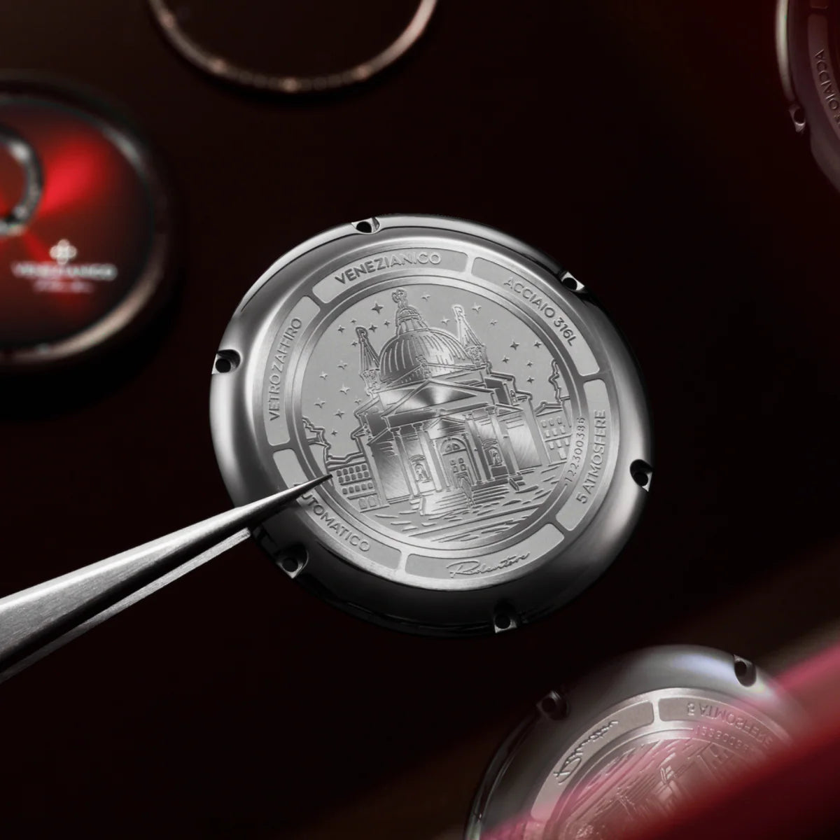 Redentore Enigma zachowuje charakterystyczny styl kolekcji Redentore – z płynną linią koperty i czystą tarczą pozbawioną indeksów, wzbogaconą eleganckimi wskazówkami dauphine. Elementy neoklasyczne zostały tu przemyślane na nowo, tworząc nowoczesną estetykę, która oddaje hołd tradycji, jednocześnie pewnie spoglądając w przyszłość.
